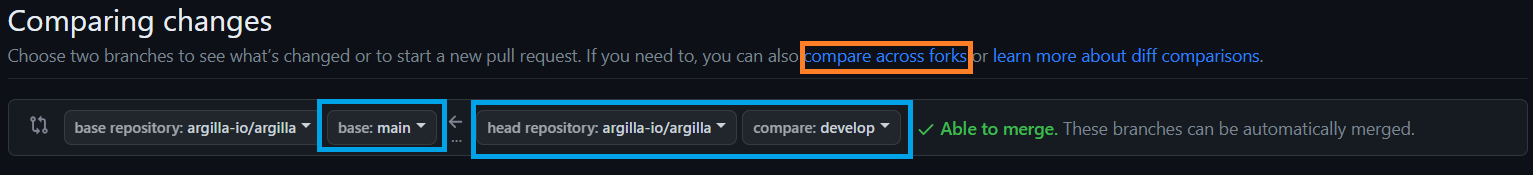 First, click on compare across forks and select the right repositories and branches.
